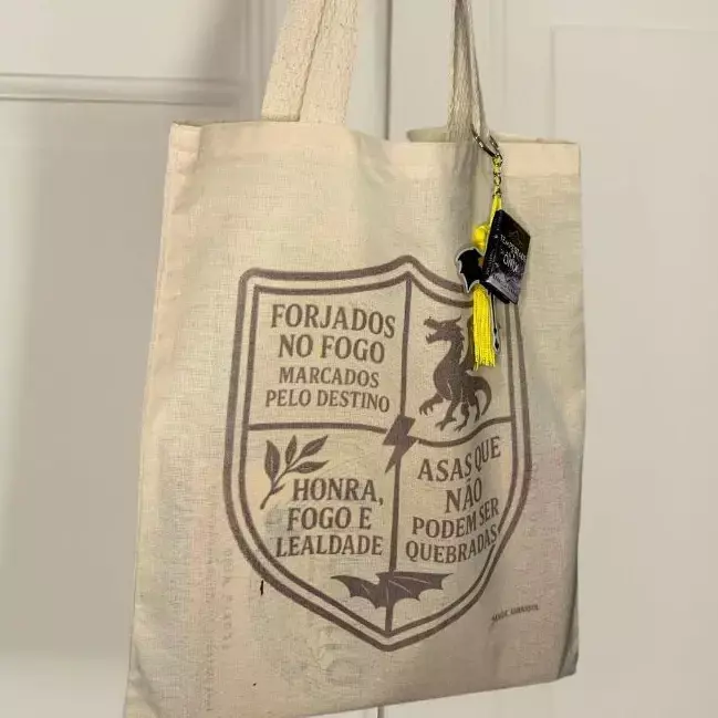 Carregue seus sonhos e aventuras com a nossa Ecobag literária, inspirada na magia de A Quarta Asa. Esta ecobag é perfeita para quem deseja unir força e fantasia em cada detalhe, trazendo a sensação de voar junto às páginas que fazem o coração disparar.
